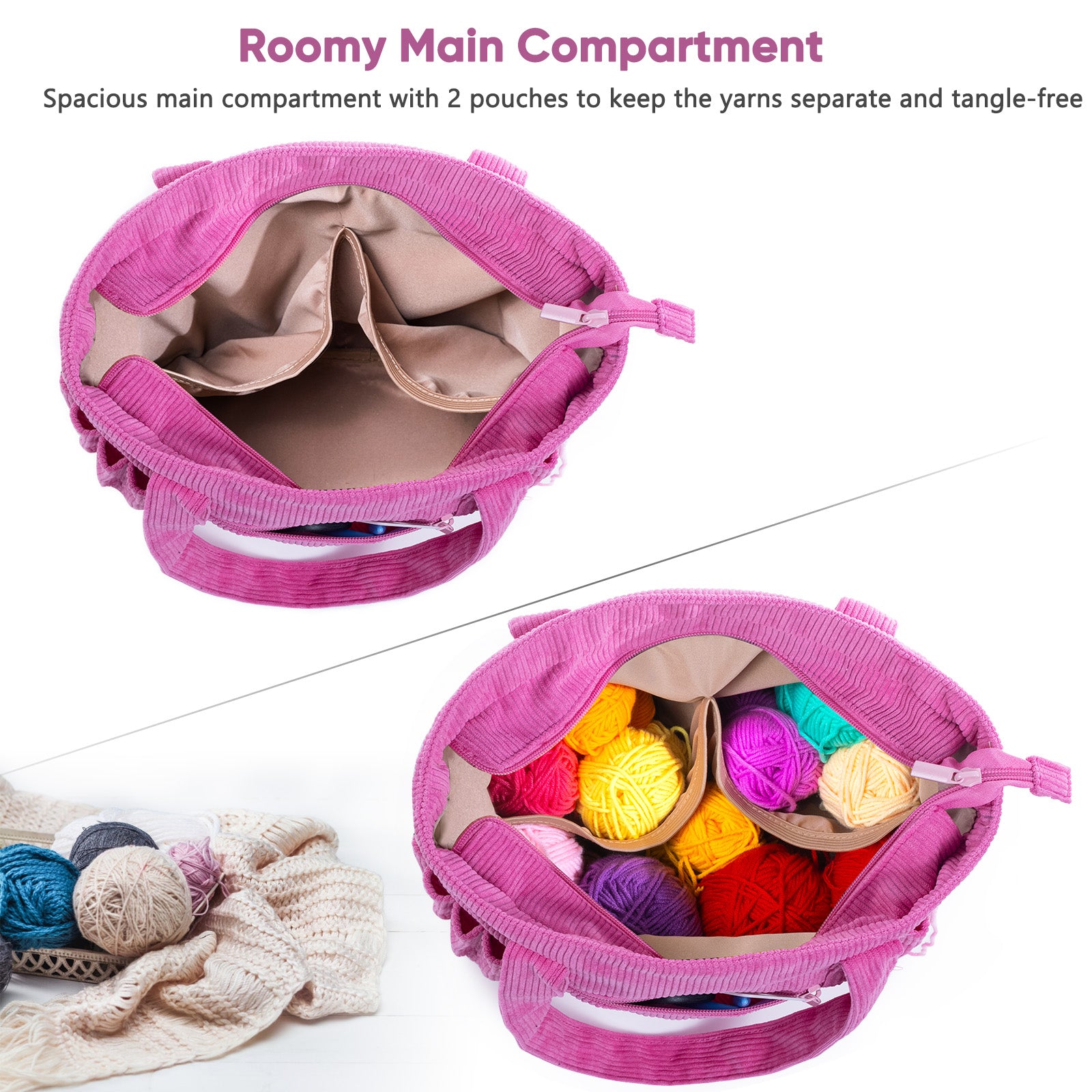 - 🧶【CONVENIENT DESIGN】Wide-open design of the knitting bag makes it easier for you to take your skeins and yarns. Two pockets in the main compartment can store small items.